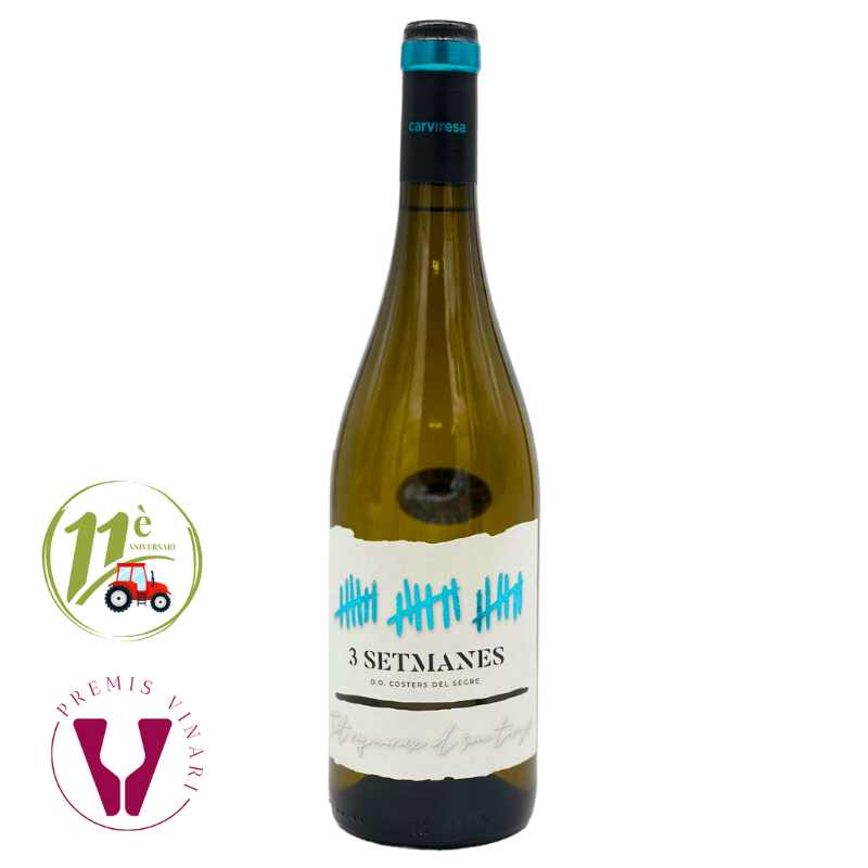 3 Setmanes Blanc és un vi elaborat amb un 70% de Chardonnay i un 30% de Macabeu, procedent de les vinyes que el Celler Carviresa té a Verdú, dins DO Costers del Segre, concretament dins la subzona de la Vall del Corb. És un vi molt potent en nas, amb una bona entrada en boca, molt floral i aromàtic, d’aquells que un glop convida a un altre.