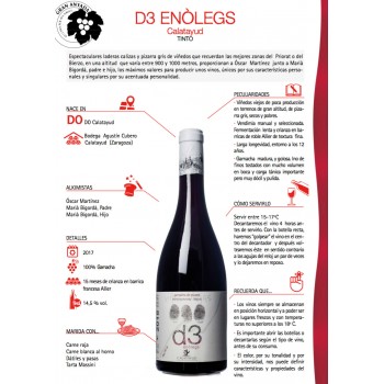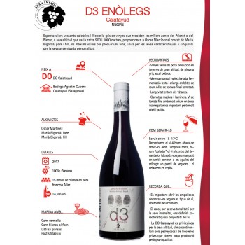 D3 Enòlegs Negre és un vi elaborat amb Garnatxa Negra procedent de vinyes velles de poca producció plantades en terrenys de gran altitud, secs i pobres, de pissarra gris, de la DO Calatayud (Saragossa). Amb 15 mesos de criança en bótes de roure Allier de textura fina i torrat alt.