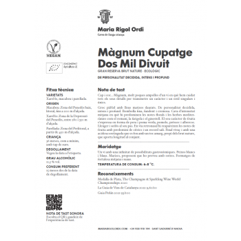 Nota de cata Cabeza y corazón… Mágnum, muy pocas botellas de un vino en el que hemos cuidado todos sus detalles para transmitir un carácter y un estilo singulares y únicos. Amarillo pálido con leves matices dorados. De personalidad decidida, intenso y profundo. Burbuja fina, fundente y cremosa. Cava de intensidad media en la que predominan las notas florales y las hierbas mediterráneas como el romero, el tomillo y el ginestel. Su carácter de fruta se expresa en forma de pera y manzana verde, pomelo, melocotón y albaricoque. Ligero y sedoso a su paso. En vía retronasal reaparecen las notas frutales con predominio de cítricos y un recuerdo salino. Final vivaz y con una acidez sostenida que se funde con un toque amargo, propio de los brut nature, que aporta longitud al conjunto.