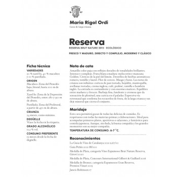 Maria Rigol Ordi Reserva es un Cava Brut Nature ecológico elaborado en Sant Sadurní d'Anoia (DO Cava) según el método tradicional, con un 40% de Macabeu, un 50% de Xarel·lo y un 10% de Parellada. Tiene más de 24 meses de crianza. Cava de calidad envío gratis!