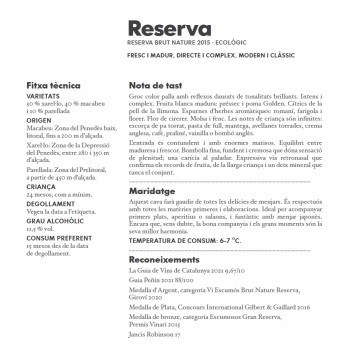Cava Brut Nature Reserva ecológico elaborado con un 3440 de Macabeu, un 50% de Xarel·lo y un 10% de Parellada, ha sido criado en rimas durante más de 24 meses dentro de la cava a una temperatura constante durante todo el año. Clarificación manual en pupitres. Degüelle manual botella por botella. Disponible en nuestra bodega online!