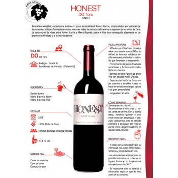 Honest és un vino procedente de uva 100% Tempranillo de viñedos prefiloxéricos situados a 700 metros de altitud y criado en barricas de roble francés de grano fino de tostado medio-alto. Este Honest es, haciendo honor a su nombre (honesto), una espectacular fusión de frutas rojas potentes y amables con un paso en boca de sensaciones largas, típicas y de gran personalidad. Un vino potente, con cuerpo y muy agradable con 18 meses de barricas de roble francés. Tiene una longevidad de 20 años.